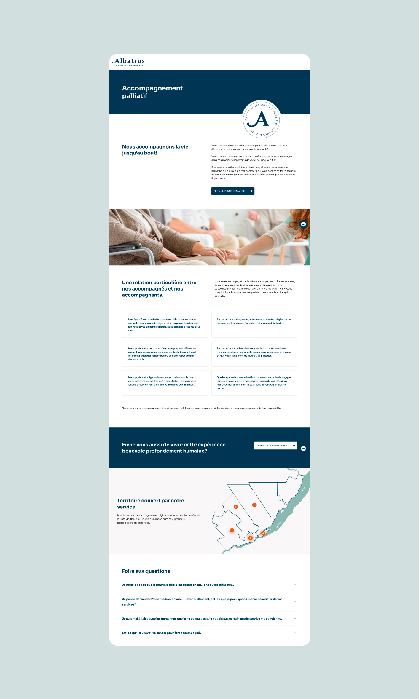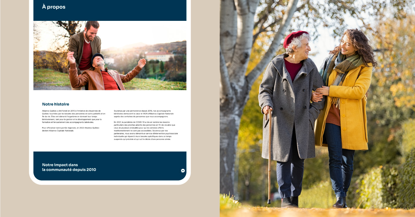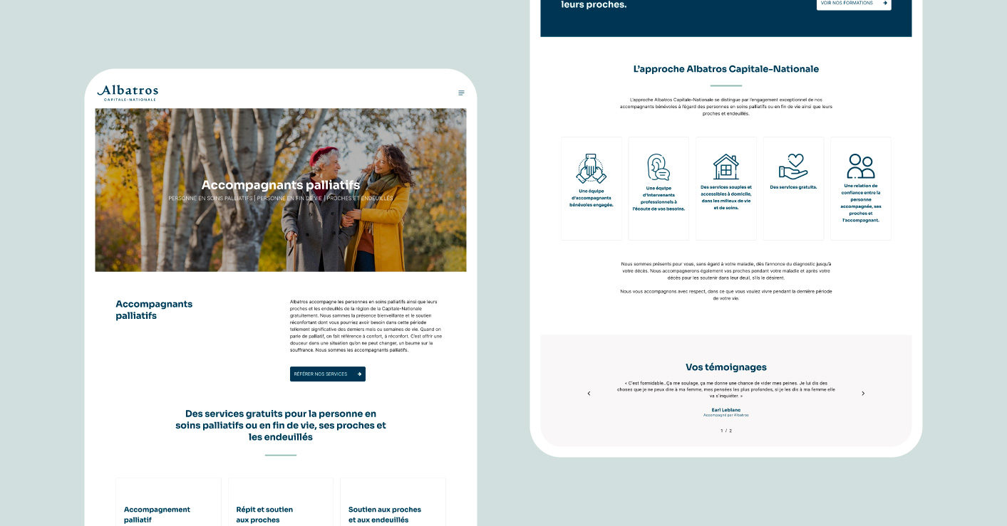 Albatros Capitale-Nationale offre des services gratuits d’accompagnement palliatif, de répit et de soutien aux personnes en fin de vie, aux proches et aux endeuillés. L’entreprise a mandaté DACTYLO afin de rajeunir son image de marque et de lui créer un nouveau site Web.