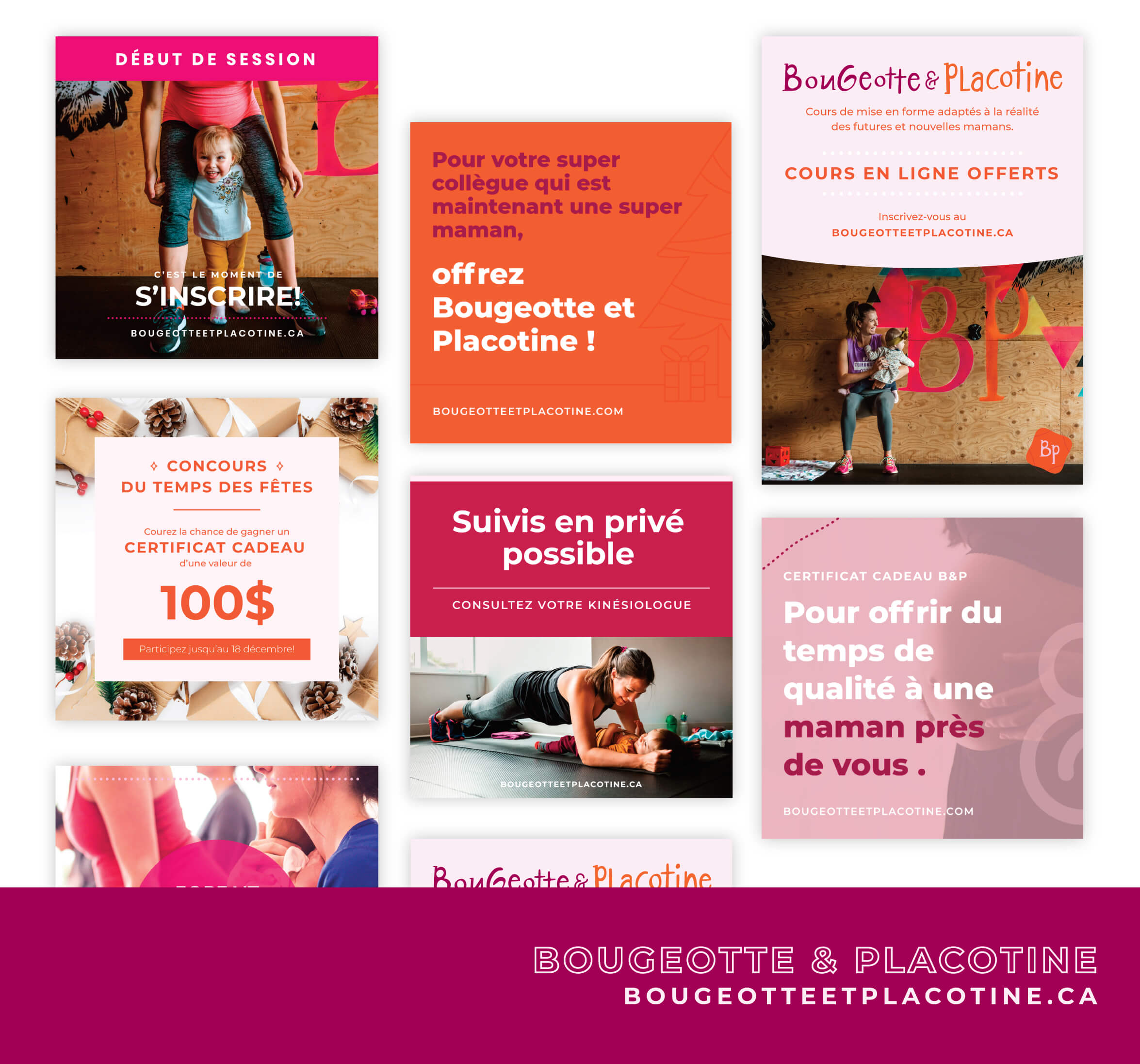 Répondant à l’appel, stratèges et designers graphique chez DACTYLO ont accompagné l’équipe de direction de Bougeotte et Placotine dans le déploiement de ses offensives publicitaires sur les plateformes Facebook et Instagram. Le résultat parle de lui-même : des communications à la fois authentiques et attrayantes qui témoignent avec brio du plaisir partagé entre maman et bébé!