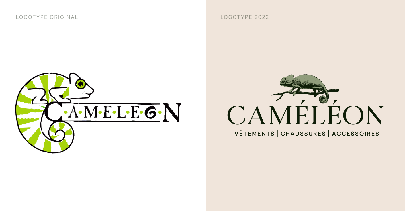 Voyez un avant/après du logo de Boutique Caméléon, stratégiquement réfléchi, dans le but de faire revivre la marque tout en évitant de la dénaturer.