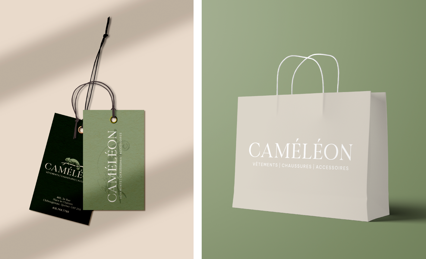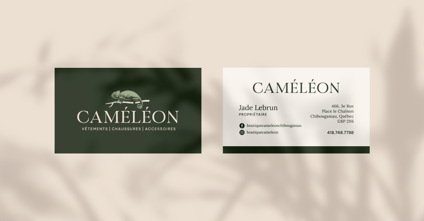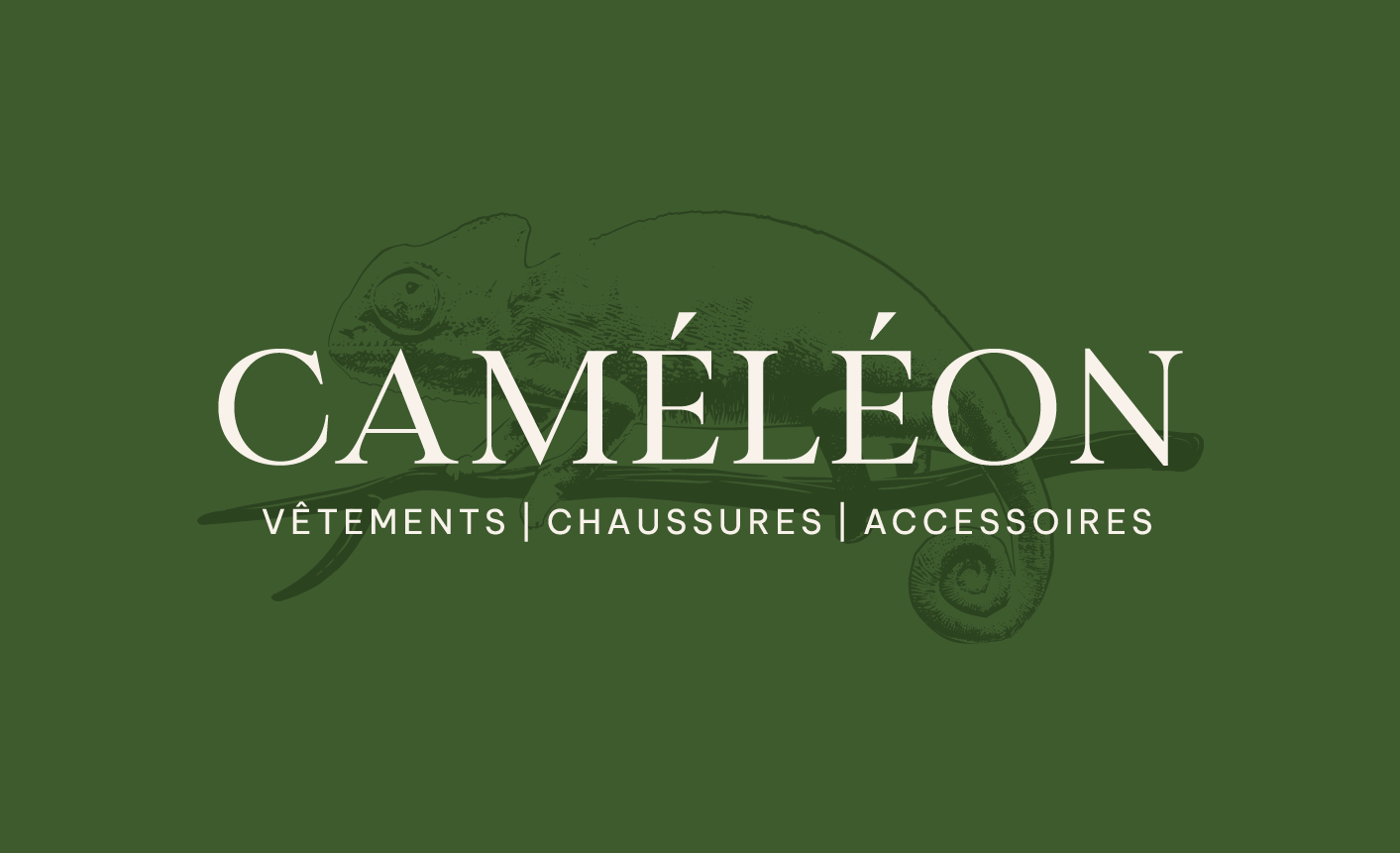 Boutique Caméléon offre des vêtements, chaussures et accessoires pour hommes et femmes, à Chibougamau. Ouverte depuis plusieurs années, la boutique est maintenant sous une nouvelle direction. Dans le cadre de cette nouvelle ère, la récente propriétaire de la boutique a mandaté DACTYLO afin de rafraîchir le logotype original ainsi que l’ambiance de marque, tout en conservant le caméléon, animal emblématique de la boutique.