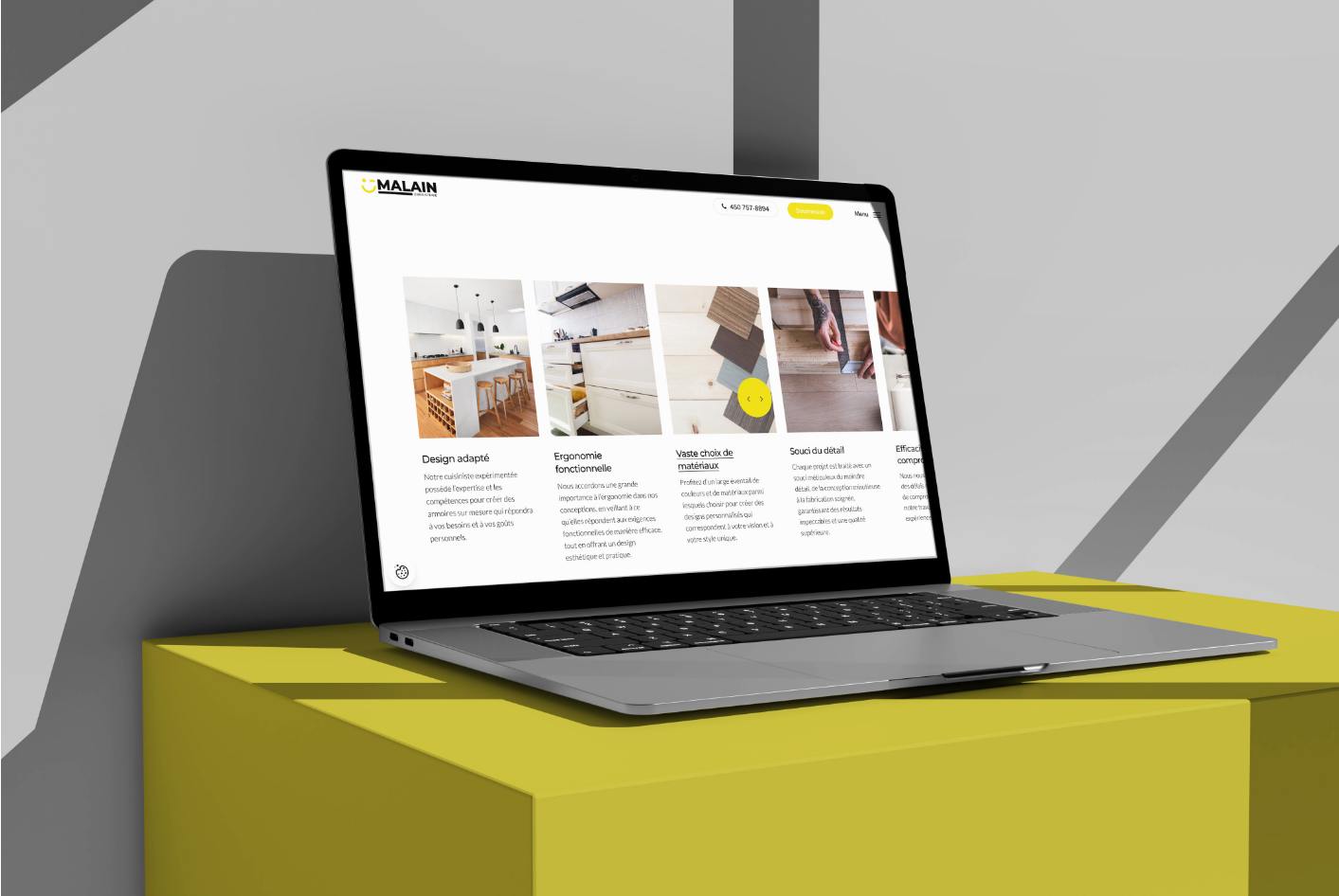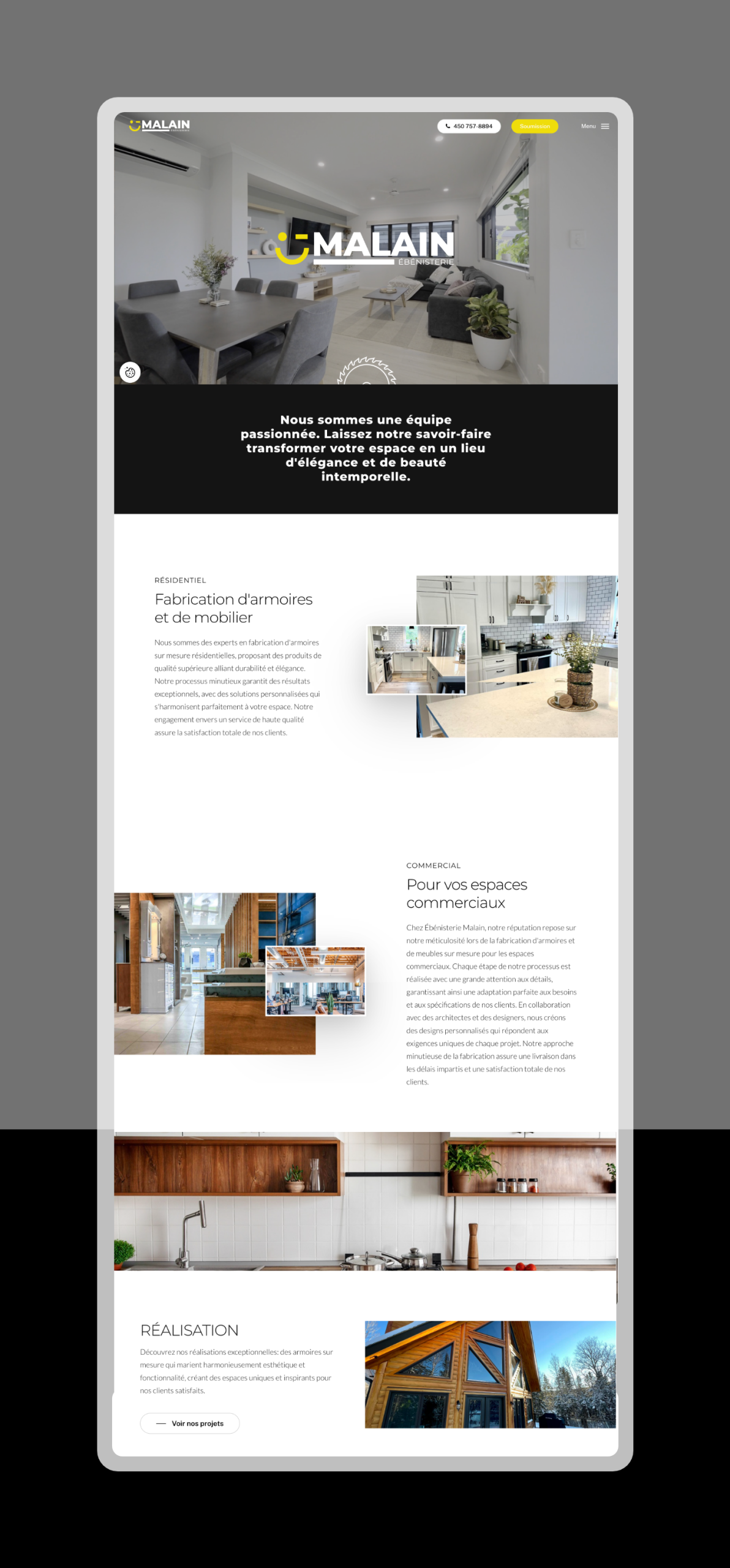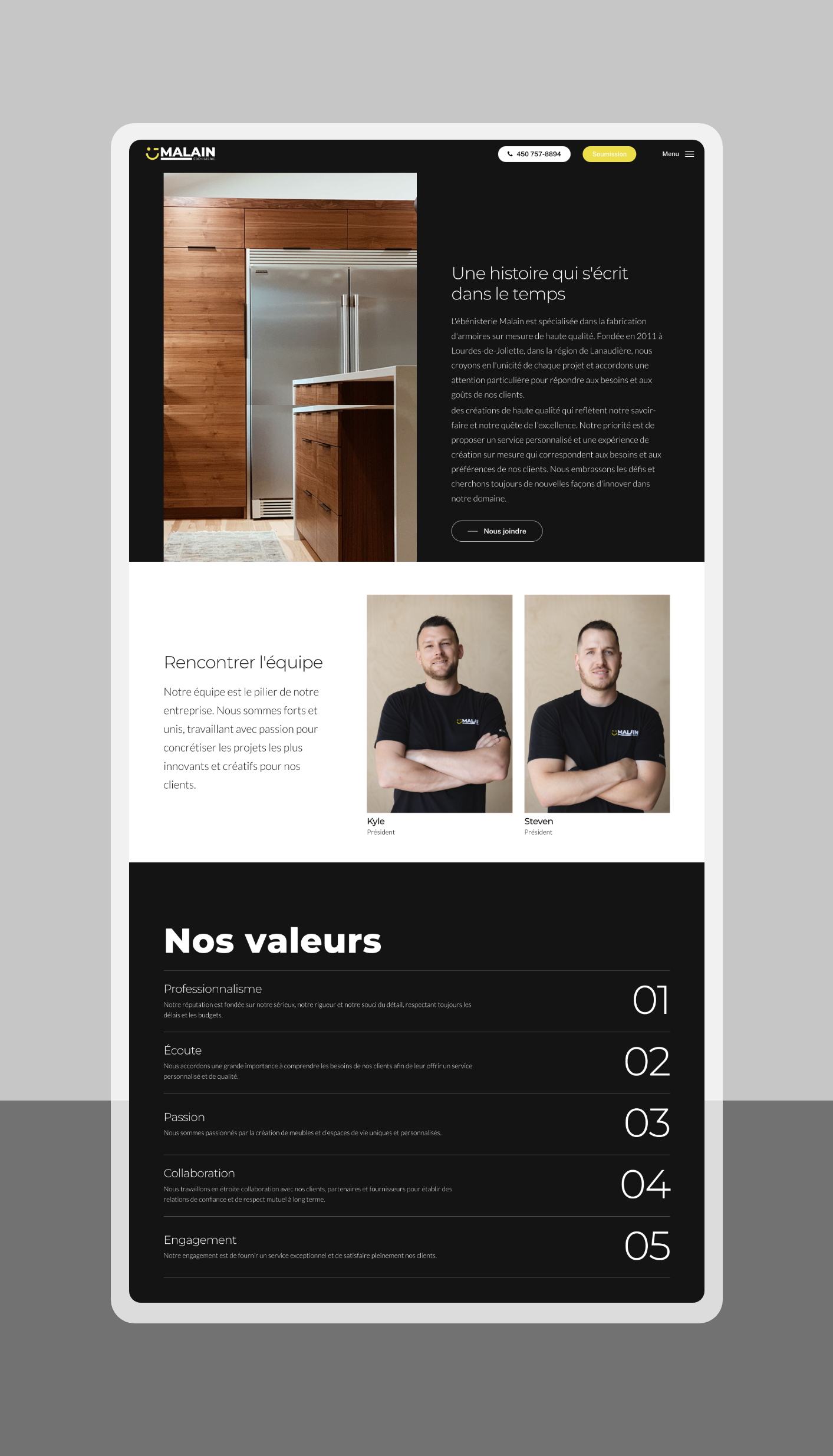 Ébénisterie Malain est une entreprise basée dans la région de Lanaudière qui se spécialise dans la conception et la fabrication sur mesure d’armoires et de meubles en bois de la plus haute qualité pour les besoins résidentiels et commerciaux. Les deux nouveaux propriétaires de l’entreprise, Steven et Kyle, ont fait appel à nos services pour la création d’un tout nouveau site Web qui reflète leur passion commune pour l’ébénisterie et qui correspond à leur identité.