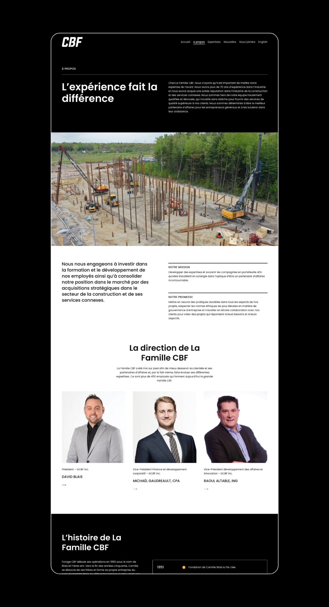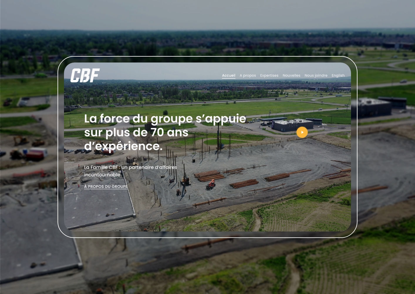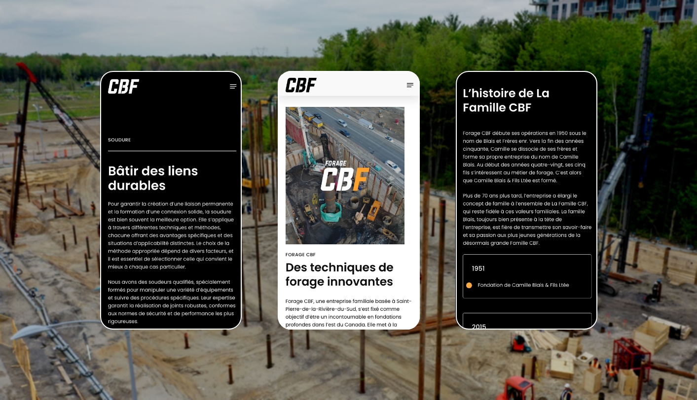 Fort d’une expérience de plus de 70 ans et d’une expansion continue, le Groupe CBF a récemment exprimé le désir de se munir d’un site Web où chacune de ses expertises serait mise de l’avant. Il a donc mandaté nos services afin qu’on lui conçoive un site Web vitrine à la hauteur de ses ambitions.