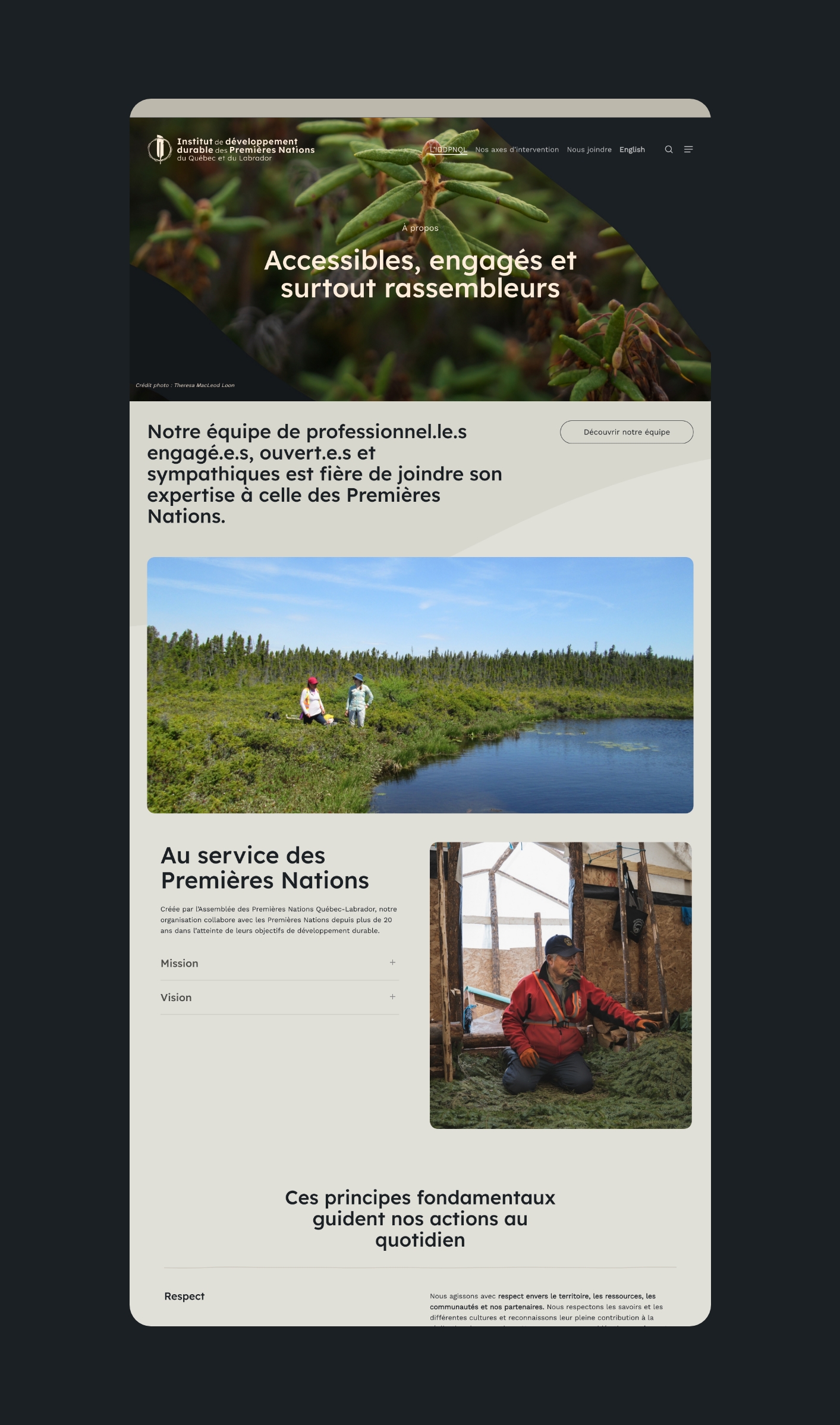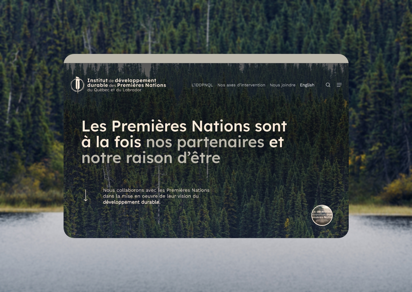 L’Institut de Développement Durable des Premières Nations du Québec et du Labrador (IDDPNQL) œuvre en étroite collaboration avec les Premières Nations, combinant les savoirs autochtones et scientifiques afin de donner vie à leur vision du développement durable. Après plus de 20 ans d’existence, l’IDDPNQL ressentait le besoin d’opérer une transformation majeure sur plusieurs fronts. Ils ont donc sollicité nos services pour une refonte complète de leur identité visuelle, de leur site Web et de leurs outils de communication. Cependant, il était impératif que ces changements reflètent les cultures propres aux multiples communautés composant les Première Nations du Québec et du Labrador, chacun d’eux regorgeant d’une foule de symboles et significations différentes, ce qui a nécessité une réflexion stratégique approfondie en amont du projet.