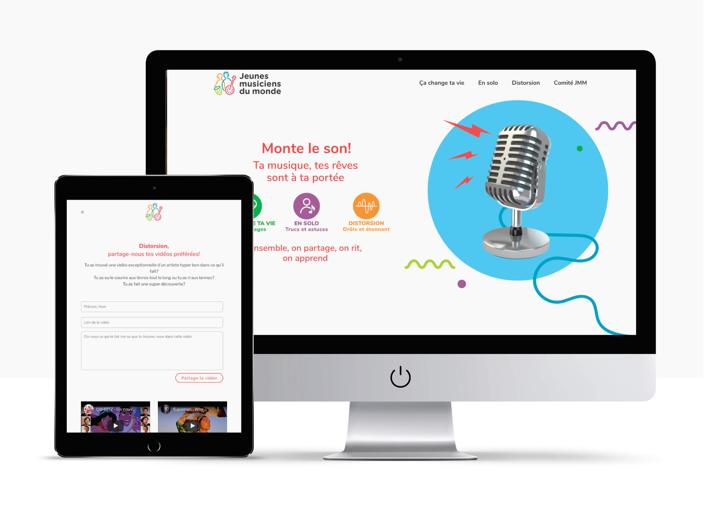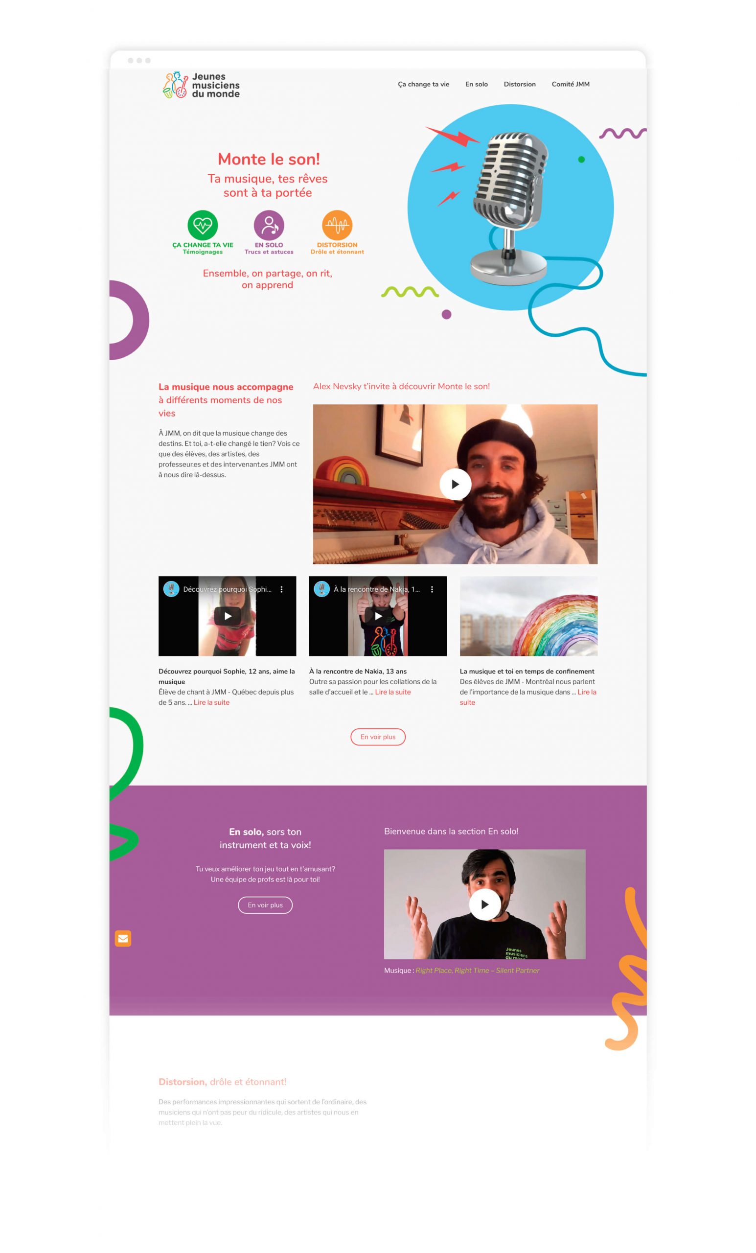 Afin de relever les défis de distanciation liés à la COVID-19, l’Organisme Jeunes musiciens du monde souhaitait mettre en place une plateforme virtuelle qui permettrait aux élèves de ses 6 écoles de poursuivre leur formation en ligne. Dynamique, collaborative et résolument musicale, cette vitrine devait en outre permettre aux usagers de partager la progression de leurs apprentissages, en plus de contribuer au développement de la communauté virtuelle de l’organisation.