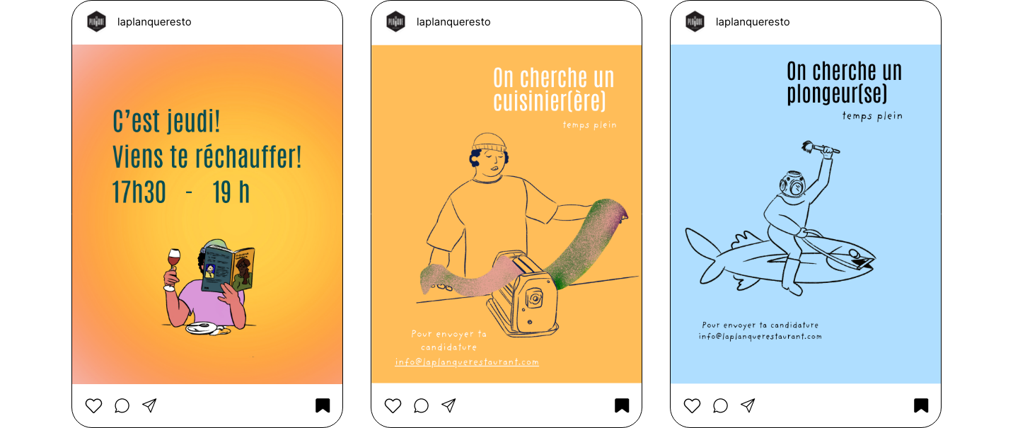 Signées par notre équipe, nos illustrations se déclinent aujourd’hui sur plusieurs supports : promotions, menus, affiches, publications pour les réseaux sociaux… Chaque coup de crayon ajoute une touche ludique et reconnaissable. Un projet créatif que nous chérissons toujours autant, presque autant que leurs plats!