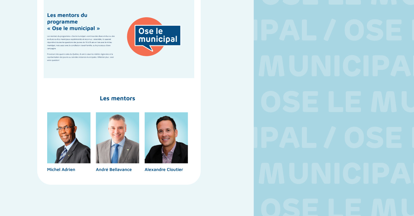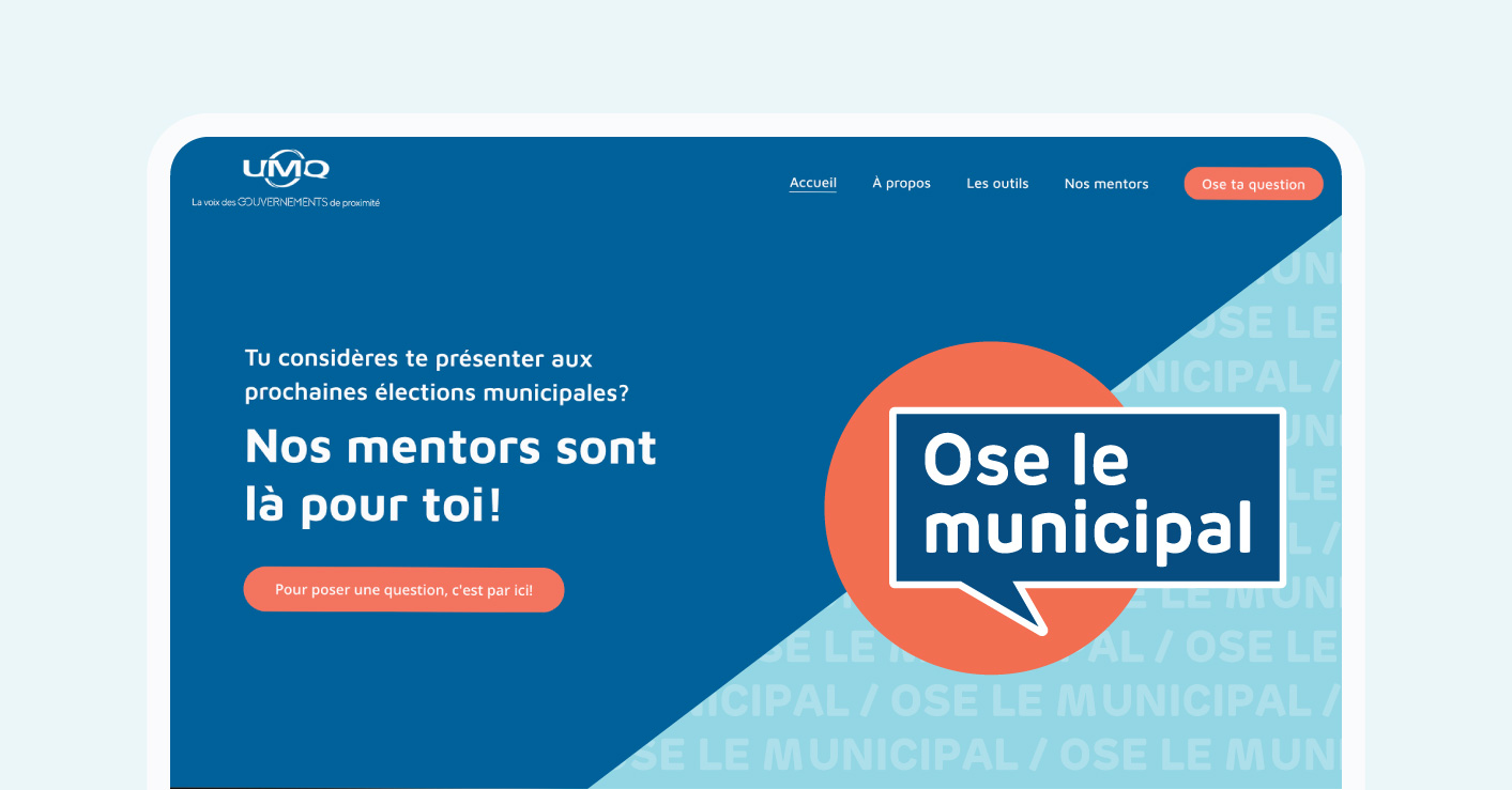 En vue du scrutin de novembre 2021, l’Union des municipalités du Québec lançait au printemps dernier « Ose le municipal ». Ayant pour principal objectif d’encourager la relève citoyenne à poser sa candidature à l’occasion de cette élection municipale, la campagne se déclinait sur différentes plateformes, en plus d’aligner un site Web thématique permettant aux jeunes candidats de profiter de mentorat auprès de plusieurs figures politiques notoires.