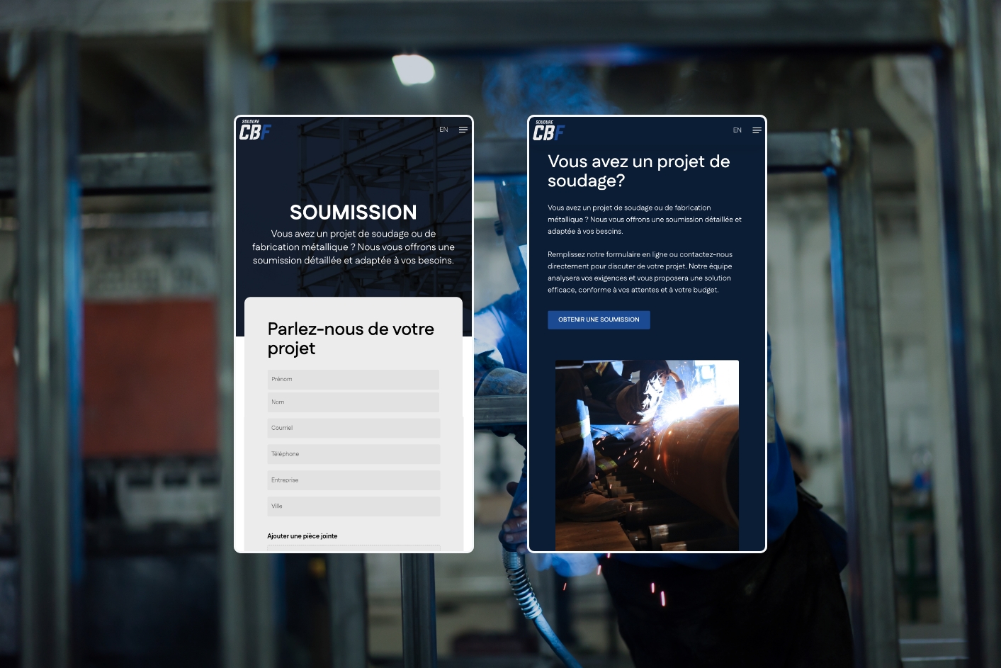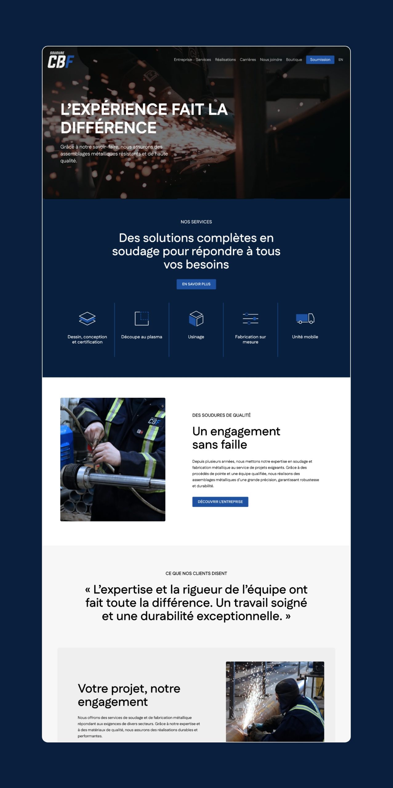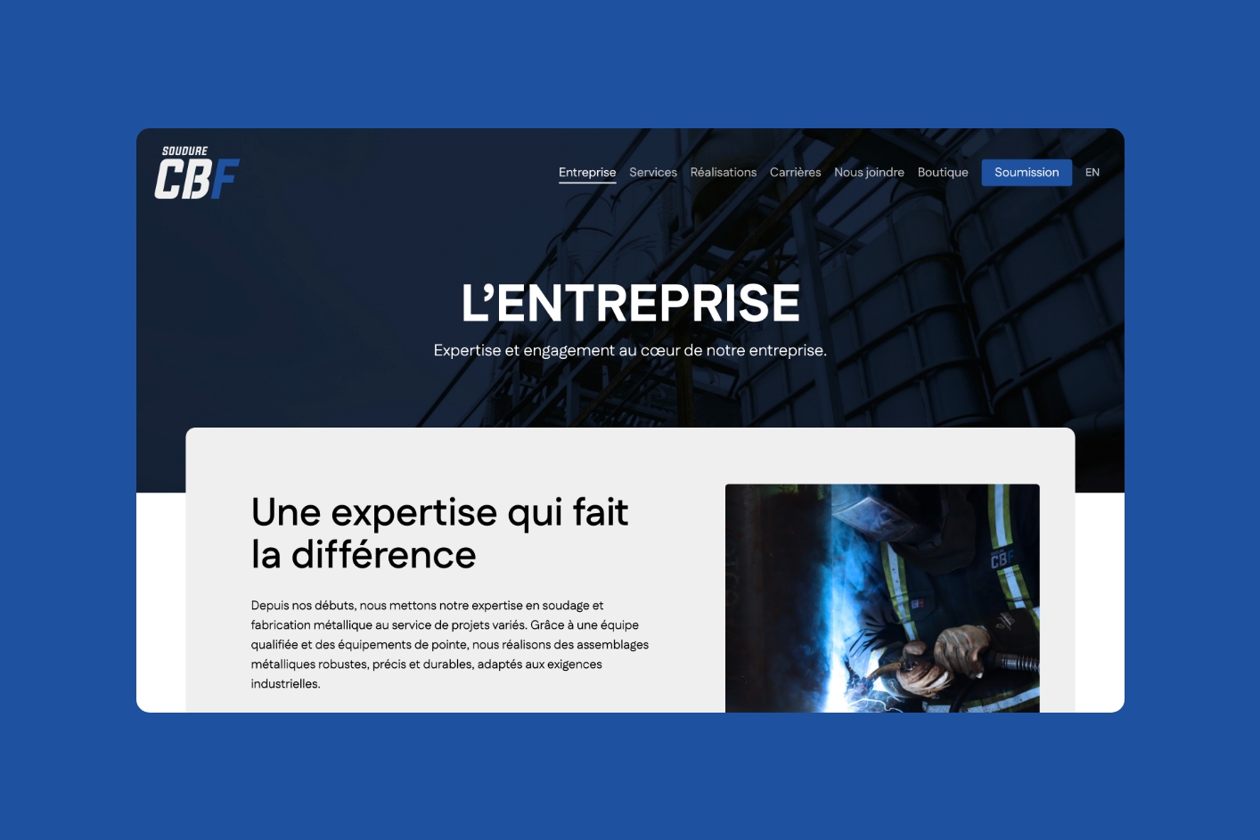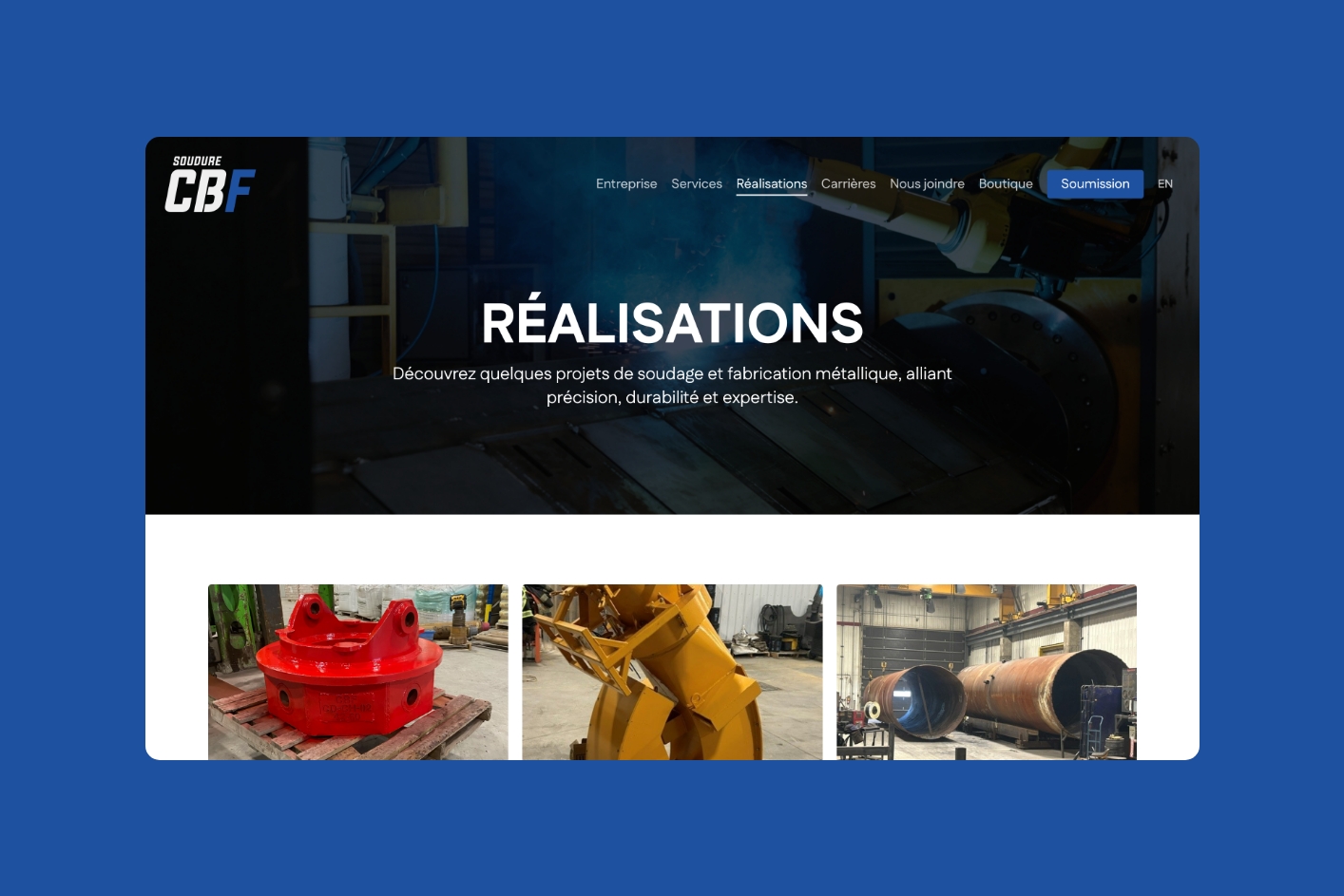 Le site met de l’avant les services et l’expertise de Soudure CBF, tout en intégrant une page Réalisation pour illustrer concrètement ses projets. Le contenu a également été traduit en anglais afin de mieux rejoindre l’ensemble de leur clientèle. Le résultat : une vitrine claire, professionnelle et parfaitement ancrée dans l’univers de la Famille CBF.